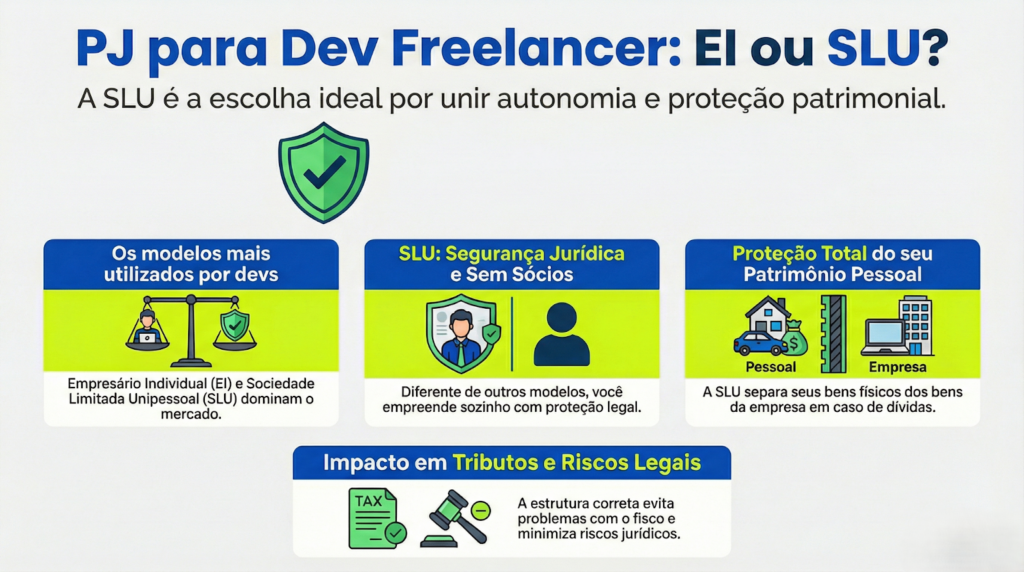 A escolha correta do tipo de empresa é parte essencial da estrutura contábil para dev freelancers, pois influencia desde a tributação até riscos legais.