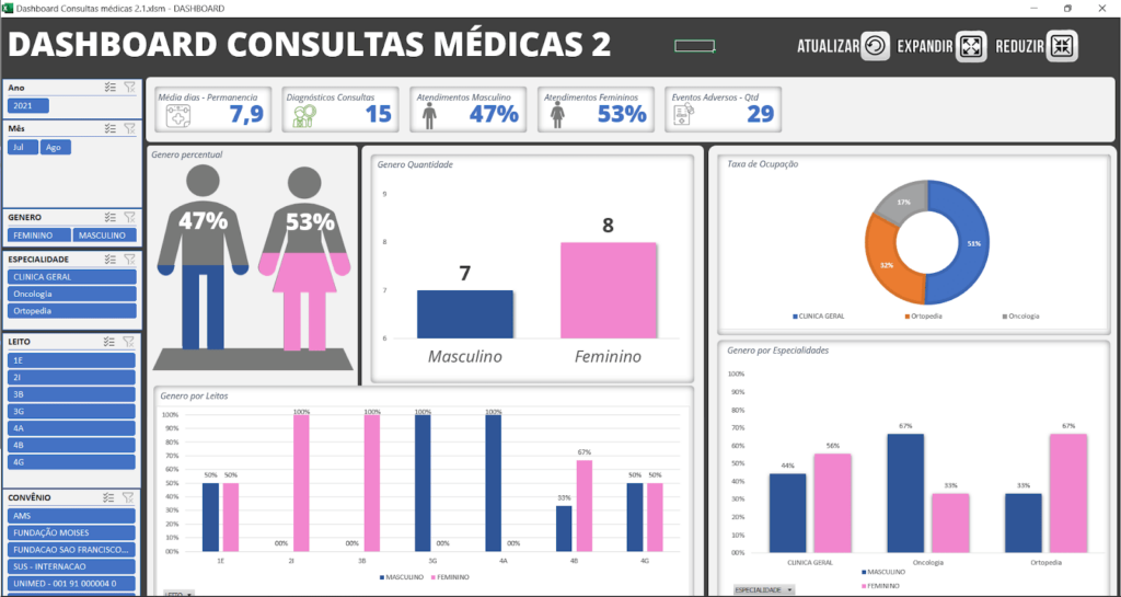| Custo por especialidade | Despesas x receita por setor | Mostra áreas lucrativas ou deficitárias |