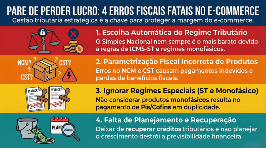 Um dos erros mais frequentes relacionados aos impostos no e-commerce é a escolha automática do regime tributário, geralmente baseada apenas no faturamento.